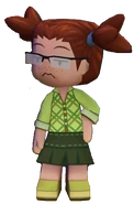 Gertrude has pale skin, red pigtails, freckles, and glasses. She wears a green outfit. In her MySims render, her MySims Racing (DS) appearance, and her MySims Agents icon, she has brown hair and no freckles.
