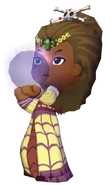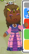 Madame Zoe wears a skull and cross bones hair accessory and a long yellow, purple, and maroon dress with a spider web pattern. Her dress has long sleeve and bat wings on her waist.