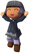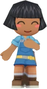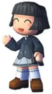 Makoto has tan skin, black hair in a bob cut with bangs, closed eyes, and a smile with lipstick. In MySims and MySims Agents, she wears a black school girl uniform with a black handbag, light gray socks, and brown loafers. In MySims Racing, Makoto wears a light blue shirt, blue overalls, a yellow belt, and brown shoes.