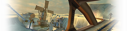 This stage appears to have several houses, windmills, dams, along with a train track. It is set in the desert and is very barren. There is also an underground mine which you can travel through. It is speculated that this town may have prospered, but fallen into an economic crisis when Morcubus came into power. Violet also mentioned she lived here before joining SkyForce.